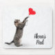 Grått tabby katt med röd hjärtballong på skrynklad vit bakgrund.