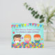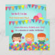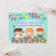Om du planerar en fest på lekplatsen eller i en studsmatta, gör då barnens gäster glada för festlokalen med den här födelsedagsinbjudan! Designen har söta små barn som leker glatt i den färgglada bollgraven. En matchande färgglad vimplande flagga hänger ovanför barnen. Baksidan har stora födelsedagsballonger! Gästerna kommer att se fram emot timmars kul med att studsa och springa runt i studsmattan, bollgraven och åka ner för rutschkanor! Anpassa enkelt med festdetaljer!