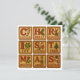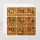"CHRISTMAS" med illustrerade block av vintage leksak och julteman: Candy cane, Holly, Reindeer, Ivy, Stocking, Träd, Mistletoe, Angel och Snögubbe.