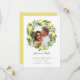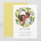 Elegantens botaniska spara datumen innehåller ett favoritfoto av förlovningen omgivet av en rund andedräkt av citrusfrukter och löv i en vattenfärgspalett av elegant med gult, grönt och vitt. Anpassa med namn, datum och plats för bröllop.