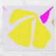 Denna etikett har en stor platt citronblomma och en fuktstjälk på gult över lilac-bakgrund.