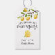 Möhippan av det roliga och moderna citrontemat är ett tecken på att citrusfrukter som hänger från gren i träd har en vattenfärg. I texten står det: "Hon hittade sin huvudsakliga klämning." Perfekt till sommarduschen.