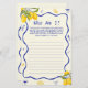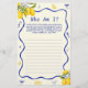 Lägg till lite roligt till ditt huvudsakliga tema för möhippa vid klämning med den här personligen Gissa vem som spelar! Med en charmerande citrondesign är det här spelet en perfekt för en möhippa med stor klämma citron firande. Det är ett underbart tillägg till ett tema för möhippa av citron, som för med sig skratt och minnen till ditt evenemang. Idealiskt för dem som tittar för citrontemat möhippa och citronidéer i italiensk temad möhippa, är detta spel ett måste för idéer om möhippa under sommaren.