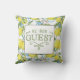 Färgfull dekorativ kudde med citron mönster som lyder: "Var vår gäst".