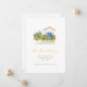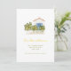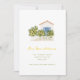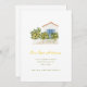 Ett häpnadsväckande nytt adress/nytt hemmeddelande med en vattenfärgad illustration av ett vitt och blått dammhus med citron träd och ett vitt betesstaket.