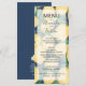 Skapa en meny för din bröllopsmottagning eller speciella händelse med vackra citroner och löv av gult i marinblått med dina menyval i chic. Klicka på knappen Anpassa för att lägga till information och klicka på länken Anpassa ytterligare för att ändra typsnitt, font färg, add and delete linjer. MATCHING-inbjudningar och fler artiklar tillgängliga i vår butik.