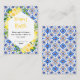 This fun and whimsical baby shower diaper raffle card features watercolor citrus lemons and foliage on a Mediterranean tile background. The text combines handwritten script and serif fonts for a stylish and modern look. This is perfect for a summer rustic baby shower.
