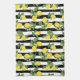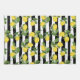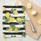 Smittsamma citroner och citronblommar på en svart och vit strimlad bakgrund.