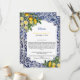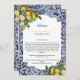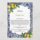 Hand målade traditionella plattor från Portugal med citroner från Medelhavet. Azulejo, blå och vit blommigt, löv-platta teckningar. Ett vackert Medelhavsmönster som skildrar citroner av gult med deras gröna och blommar mot en blå och vit vintage i Portugal mönster. Texten i bröllop är elegant ramad med en vit geometrisk form. Unik Azulejo-blått och vit blommigt bröllop välkomnar den italienska kortdesignen med modernt inslag. Det finns också möjlighet att matcha bröllopsinbjudningar och andra artiklar i kontorsartiklar.