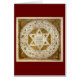 Den här bilden är yttersidan av Leningrad Codex som visar en David-stjärna på en kvadrat medan fyrkanten är i en cirkel. Det finns hebreiska verser från Tanakh runt stjärnan och fyrkanten, och i mitten av stjärnan finns ett engagemang från författaren Shmuel ben Ya'akov till hans lärare. Detta kort kan användas för en mängd tillfälle. Lägg till en egen text framtill så kan du flytta bilden och ändra bakgrunden färg till kostym efter behov. Kontakta mig om du behöver hjälp med att lägga till text, engelska eller hebreiska. Leningrad Codex, så kallad som handskriven bok i motsats till en rulla, är det äldsta fullständiga manuskriptet av Tanakh i Hebrew, med den maoretiska texten och tiberiska vokaliseringen. Den skrevs i Kairo 1008 CE. Aleppo Codex, som åtgärdades i Leningrad Codex mot detta, är flera decennier äldre, men delar av den har saknats sedan 1947 CE, skapar Leningrad Codex som det äldsta fullständiga indexet för den tiberiska mesorah som har överlevts oförändrat än i dag. Leningrad Codex är ett nyverk av tiberiska maoretes och har under flera århundraden varit äldre än andra hebreiska manusskript som använts för alla tidigare upplagor av tryckta hebreiska biblar fram till Biblia Hebraica. Den fungerar som en primär källa för att återfå detaljer i de delar av Aleppo Codex som saknas. Den bibliska texten som finns i kodexen innehåller texten från Hebrew brev tillsammans med tiberiska vokaler och konserver. Dessutom finns det maskoretiska anteckningar i marginalerna. Det finns också olika tekniska tillägg som handlar om text- och språkliga detaljer, av vilka många är målade i geometriska former. Kodexet är skrivet på avkomma och bundet till läder. Leningrad Codex, som efter ett årtusende är utomordentligt pristiskt i villkor, är också ett exempel på medeltida judisk konst. Sexton av sidorna innehåller dekorativt geometriskt mönster som belyser passager från texten. På Carpet Page visas en stjärna med namn på skribenterna på kant och en välsignelse skriven i mitten. Ordningen bokar i Leningrad Codex följer den tiberiska textuella traditionen, som också är en av den senare traditionen med sefardiska bibliska manuskript. Denna ordning för bokar skiljer sig markant från ordningen för de flesta tryckta hebreiska biblar för bokar i Ketuvim. I Leningrad Codex är Ketuvims ordning: Chronicles, Psalms, Job, Proverbs, Ruth, Sång of Sång, Ecclesiastes, Lamentations, Esther, Daniel, Ezra-Nehemiah. Leningrad Codex är ett stort bok som är avsett för offentlig använda. Den är utsmyckad med tjocka vita sidor. Kodexen ligger i Rysslands nationella Bibliotek. Dess tidigare ägare, insamlaren av Krim Karaite Abraham Firkovich, lämnat inga uppgifter i sina skrifter om var han hade förvärvat koden, som fördes till Odessa 1838 och senare överfördes till Imperial Bibliotek i Sankt Petersburg.