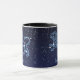 Mugg med zodiaksymbolen för Leo i mjuk silver-blått, överdragen med stjärnorna i konstellationen, mot himmel-stjärnans bakgrund, graderad från djup midnattsblå till svart