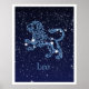 Poster med symbolen för Leo i mjuk blått silver, överdragen med stjärnorna i konstellationen, mot en stjärnbakgrund i himlar som är graderad från djup midnattsblå till svart.