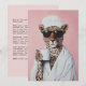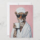En snyggt leopard har en mysigt morgon, inslagen i en vit robe med en handduk på huvudet, sippkaffe medan den bär solglasögon mot chicens rosa.