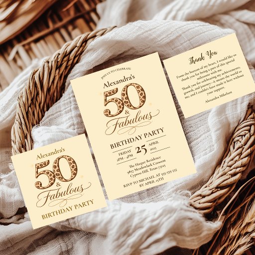 Celebrate turning 50 with a bold and stylish twist using this elegant leopard print design. Featuring a “50 & Fabulous” centerpiece with soft neutral tones and subtle animal print detailing, this layout blends modern sophistication with a touch of wild flair. The warm beige background paired with rich brown accents creates a balanced, versatile look that works beautifully for both casual and dressed-up events. A chic and confident choice for anyone who wants their milestone moment to stand out with personality.