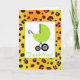 Ett barnduschkort som visar en illustration av en vagn i grönt baby över orangen leopard. Insidan är tom.