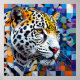 Stiliserad avbildning av ett leopardhuvud, med livfulla färger och djärva geometriska mönster i bakgrunden. Leoparden avbildas i profil, med betoning på dess slående drag som dess genomträngande bärnstensfärgade ögon, framträdande morrhår och unika fläckmönster. Bakgrunden består av en mängd färgglada former, som skapar en dynamisk kontrast till leopardens mer naturalistiska återgivning. Den övergripande stilen blandar realism med abstrakt konst, vilket ger den en modern, energisk känsla.