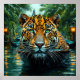 En slående, närsynt bild av ett stort leopard med ett tydligt markerat ansikte, där inslag av både en tiger och en jaguar kombineras. Dess pulserande orange och svarta päls står i kontrast till den lush grönt som omger den. Katten har piercing grönt ögon som riktar uppmärksamheten mot en lugns baksida, en avlyssningsvattenväg. Mjuk, atmosfärisk belysning lyfter fram lyktor och tropiska växter och skapar en förtjusande och mystisk ambians. På det hela taget framträder en känsla av storhet och intolerans, och vilda djur blandas med en god, bildlig miljö.