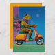 En levande, surrealistisk teckning med en leopard som rider en lysande orange mot ett levande blå himmel. Med rosa ros i bakgrunden och en sjal av snyggtens lila förenar den här scenen vilda djur och stadshygighet och skapar en visuell bild som fångar öga.