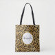 En tote väska med snyggt mönster. Exotiska svarta leopardfläckar på guld. Vild ännu elegant stil. Överst är en vit cirkel ram med en faux guld-folie gräns, med personligens monogram initialt och namn inuti.