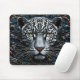 Slående och intrikat designad mittpunkt i form av ett leopardhuvud, kännetecknat av dess karakteristiska fläckar och livfulla bärnstensfärgade ögon. Runt leoparden finns frodiga, sammanflätade blomsterdetaljer som inkluderar livfulla röda blommor, vilka tillför en stark kontrast mot den övervägande mörka bakgrunden. Den övergripande kompositionen kombinerar en känsla av elegans och vild skönhet, och blandar djurets intensiva uttryck med de känsliga blomsterlika motiven. De detaljerade texturerna hos både leoparden och den omgivande bladverken skapar ett rikt, visuellt engagerande konstverk som fångar en harmonisk blandning av natur och konstnärskap.
