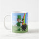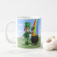 The Leprechaun stands with a three-leaf clover in his hand next to a pot of gold at the end of the rainbow where he is ready to celebrate. St. Patrick's Day.