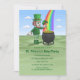 The Leprechaun stands with a shamrock in his hand next to a pot of gold at the end of the rainbow where he is ready to celebrate St. Patrick's Day.