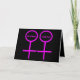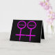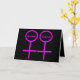 Det här stilrena vykortet är designat för lesbiska. Det har två rosa kvinnosymboler som står sida vid sida. Bakgrunden är svart och det finns anpassningsbar rosa text inuti varje symbol för att skriva namn. Det här kortet är perfekt att skicka till ett lesbiskt par på Alla hjärtans dag eller på deras bröllopsdag. Insidan av kortet är svart med helt anpassningsbar rosa text. Du kan skriva vad du vill och göra det verkligt personligt.
