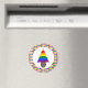 Den här magneten i fantastisk har en regnbåge i Julgran med två små kvinnliga symboler av rosa sitta ovanpå träd. Varje lagrar i träd är en annan färg av regnbågen. Träd ligger i en brunkruka och omges av presenter. Varje present är också en färg av regnbågen, med olika band och färgad för regnbåge. En fin design för lesbisk par i julas.