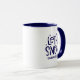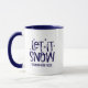 This ceramic coffee mug is shown in a festive holiday print let it snow somewhere else.