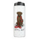 Let's Go! (for a walk) Flat-Coated Retriever Dog (liver) - Cute dog cartoon with a red leash and collar in his mouth, ready to go do something...go for a ride, go play, go for a walk, on a vacation, anywhere! Copyright © Angi Laframboise. Funny dog breed and dog obedience training themed gifts for dog lovers.
