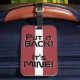 Lettlands nationella Flagga Funny Patriotic Luggage Tag med Lettlands nationella färg som täcker framsidan av märkrn. Lustigt text "Sätt tillbaka den!" Det är MINE" är skrivet över flagga färg. Anpassadet Text är fullt ut med funktionen "Anpassa den!". Andra sidan av märkrn är reserverad för din information. Den här toppen är Lettlands resväska och perfektens följeslagare till din resväska och den vackra gåvan till vilken tillfälle som helst. © LänderAvVärlden