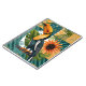 Das Bild zeigt einen prächtigen Tukan mit einem strahlend orangefarbenen Schnabel, der stolz auf einem Ast sitzt. Umgeben von üppigen grünen Blättern und einer leuchtenden Sonnenblume, strahlt es eine friedliche, exotische Wärme aus. Die lebendigen Farben und das patchworkartige Design vermitteln ein Gefühl von Naturverbundenheit und heiterer Gelassenheit.