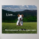 En inspirerande poster med ett vackert, dynamiskt foto av en hund som studsar genom fält, med ett uttryck för ren glädje och frihet, och frasen: "Lev.. som någon lämnade grind öppet."