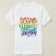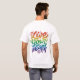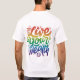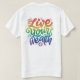 En pulserande t-shirt-design med frasen "Live Your Wealth." i ett fet graffiti stil med flera färgader. Texten är omgiven av stänk och färgdroppar som skapar ett dynamiskt och energiskt utseende. Utformningen är en perfekt för dem som vill leva ett gott och välmående liv