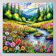 Färggrann äng med en variation av vildblommor och en mjuk ström som flyter genom, omgiven av träd och berg. Fångar naturens livfulla skönhet, stillhet och frid.