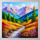 Färgglad bergsutsikt med en strömmande bäck, blommande blommor, frodiga ängar och majestätiska toppar under en levande blå himmel, som skapar en fantastisk skildring av naturlig skönhet och stillhet.
