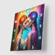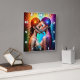 Två kvinnor med påfallande makeup står nära, belysta med vibrerande, strålande färg som skapar en visuellt bedövande och eterisk atmosfär.
