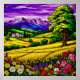 Ljus färgat glaskonstverk som skildrar ett lantligt landskap med blommor, berg, träd, ett hus och levande färger som påminner om naturlig skönhet. En detaljerad och konstnärlig skildring av lugnt landsbygdsliv.