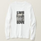 Den här t-shirt-designen har det klassiska mantrat "Live/Laugh/Kärlek" som är placerat lodrätt och skapar en visuellt intressant texturerad rutnätsliknande effekt. Det enkla men kraftfulla budskapet i kombination med den unika layouten gör denna design både snyggt och inspirerande.