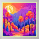En levande och färgrik målning av en skog på natten med fullmåne. Träden har en mängd olika färger, inklusive lila, orange och blå. Himmelen är fylld med stjärnor (Denna design är gjord med AI). Beställ idag och omfamna glädjen av shopping!