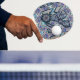 Ett färglöst mönster med lagrar av rå metall. Teknik och konst, tidslängdens komplexitet för kom, liv och artificiellt liv av Alexandra Cook alias Linandara. Del av VopreKin-samlingen. En elegant som upprepar blått och violett mönster med bitar av grått metall ovanpå.