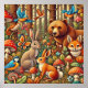 En livlig skogsillustration som visar olika djur som en räv och björn, fåglar, svampar och blommande element i en dynamisk komposition.