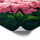 Upplyst solnedgång över lugna havsvågor ramade av blommande körsbärsträd och frodiga skogar, utstrålar lugn och naturlig skönhet, perfekt för konstnärliga, naturliga eller lugna illustrationskoncept.