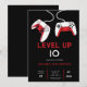 Level Up 10 video game birthday party invitation featuring a bold black background, two white game consoles, and striking red accents. A modern, high contrast design perfect for celebrating a gamer’s 10th birthday in epic style.