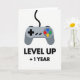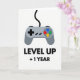 This card features a grey video game controller centered on a plain white background, with a black cord that curves upward. The controller has a dark D-pad on the left, small start and select buttons in the middle, and four round action buttons on the right in red, blue, green, and yellow. Everything is neatly arranged and easy to spot, giving the design a simple, modern look. Under the controller, the card says “LEVEL UP” and then “+ 1 YEAR” in black block letters that look like a straightforward sans-serif font. The text sits below the image in a stacked layout, lined up down the middle, and it reads like a fun message for someone you care about. It’s a sweet way to say you’re proud of them and want to celebrate another year together, whether that’s romance or close friendship ❤️