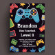 Level up the fun with this cool kids gaming birthday party invitation! Featuring a watercolor video game controller and bold modern lettering, this design is perfect for gamers who love to play and celebrate. Easily personalize it with your child’s name, age, party date, and details to create an invitation that’s ready to power up the excitement. Great for boys or girls who enjoy console games, online fun, or arcade-style parties!