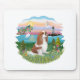 En Blenheim Cavalier Kung Charles spanjor har en vacker dag vid kusten med en fyr utanför kusten och en segelbåt som seglar längs det blå vatten. En blå fåglars sjungor vid gren som fiskmås flyger förbi.