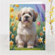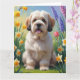 En glad hund sitter fridfullt på frodig grön gräs, omgiven av färggranna vårblommor under en mjuk blå himmel. Denna digitala oljemålning fångar ett stillsamt ögonblick med uttrycksfulla penseldrag, varma färger och en känsla av mild glädje.