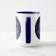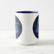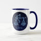 Mugg med zodiaksymbolen för Libra i mjuk silver-blått, som en rund medallion, överdragen med stjärnorna i konstellationen, mot en himmel-stjärnbakgrund som är graderad från djup midnattblått till svart.