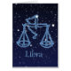 Kort med zodiaksymbolen för Libra i mjuk blått silver, överdragen med stjärnorna i konstellationen, mot bakgrund av himlar från djup midnattsblå till svart.